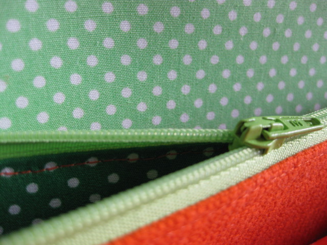 ファスナー小銭入れの中はちょっと深めの緑の水玉柄。